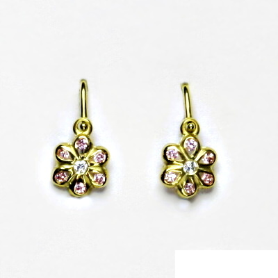 Zlaté náušnice, čiré, růžové zirkony, žluté zlato, dětské náušnice VE 251