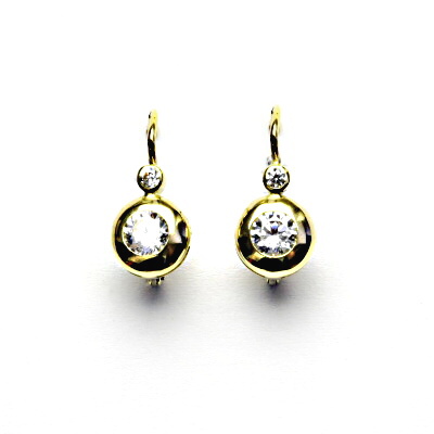 Zlaté náušnice se dvěma čirými zirkony, žluté zlato ryzosti 585/1000. Celková výška náušnice je 16 mm, zdobná část měří 11 x 8 mm, zirkonky mají v průměru 2 a 4 mm. Orientační hmotnost šperku 3,09 g.