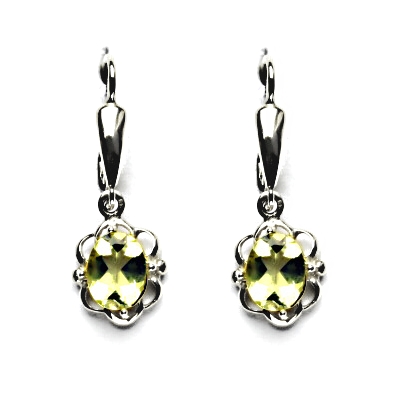 Zlaté náušnice s přírodním kamenem olivový křemen-lemon velikosti 8x6 mm. Náušnice se zapínají na klasický patent, jejich celková výška je 30 mm, rozměry zdobné části 11x5 mm. Orientační hmotnost šperku 3,56 g. Náušnice jsou vyhotoveny z bílého zlata ryzosti 585/1000.