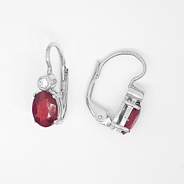 Diamantové náušnice s přírodními rubíny vyrobené z bílého zlata 585/1000. Velikost diamantů je 2,25 mm celkem cca 0,09 ct v kvalitě VS/G.