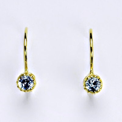 Zlaté náušnice na klasické patentové zapínání jsou zdobeny zirkonem akvamarinem