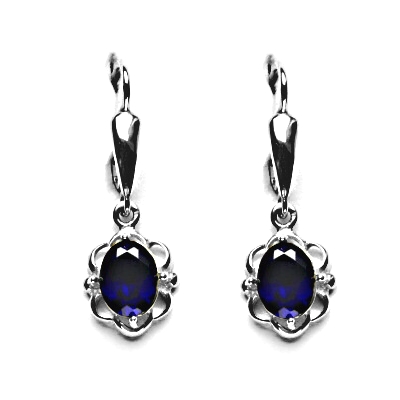 Zlaté náušnice osazené zirkony safír velikosti 8x6 mm. Náušnice se zapínají na klasický patent, jejich celková výška je 30 mm, rozměry zdobné části 11x5 mm. Orientační hmotnost šperku 3,56 g. Náušnice jsou vyhotoveny z bílého zlata ryzosti 585/1000.