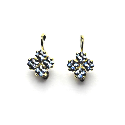 Zlaté náušnice se zapínáním na klasický patent, zdobené čtyřmi modrými zirkonky velikosti 3 x 3 mm. Rozměry zdobné části jsou 8 x 8 mm, celková výška náušnice 15 mm. Orientační hmotnost šperku je 2,45 g. Vyhotoveno ze žlutého zlata ryzosti 585/1000.