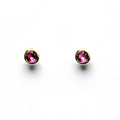 Zlaté náušnice se zapínáním na šroubek, zdobené zirkony v barvě rubínu - průměr 3 mm. Náušnice jsou vyhotoveny ze žlutého zlata ryzosti 585/1000, orientační hmotnost šperku 0,81 g.