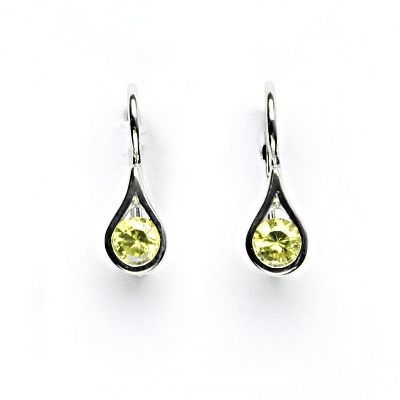Elegantní dámské náušnice osazené zirkony žluté barvy, se zapínáním na klasický patent. Zdobná část měří 9x5 mm, průměr kamínku je 4 mm, celková výška náušnice včetně klapky 16 mm. Šperk je vyroben z bílého zlata ryzosti 585/1000 (14 kt), orientační hmotnost 1,96 g.