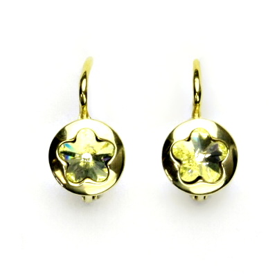 Náušnice ze žlutého zlata jsou zdobeny Swarovski krytalem ve tvaru kytičky. Barva krystalu je jonquil. Materiál je zlato 585/1000. Celková výška nášnice je 15 mm. Průměr zdobné části je 8 mm. Náušnice mají zapínání na klapku.