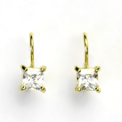 Náušnice ze žlutého zlata s čirými zirkony o rozměru 5x5 mm. Materiál je zlato 585/1000. Náušnice mají zapínání na klapku. Orientační váha náušnic je 2,59 g. Celková výška náušnice je 15 mm.