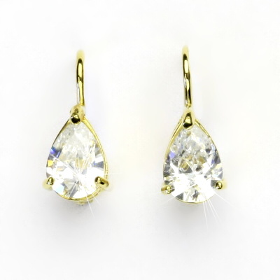 Zlaté náušnice s čirým zikonem ve tvaru slzy o rozměru 8x6 mm.