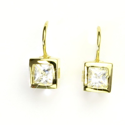 Náušnice ze žlutého zlata zdobí čiré zirkony o velikosti 5 x 5 mm .