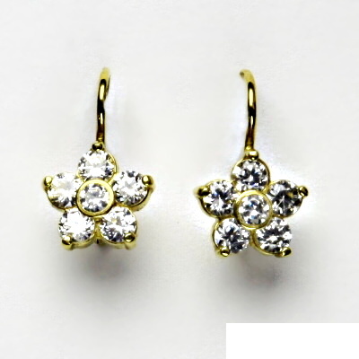 Dámské náušnice ze žlutého zlata mají tvar kytičky a jsou zdobeny čirými zirkony. Materiál je zlato 585/1000. Rozměr kytičky je 10 mm. Náušnice mají zapínání na patent. Celková výška náušnice je 15 mm. Orientační váha náušnic je 2,69 g.