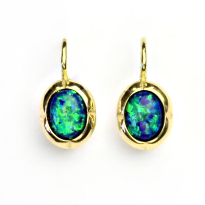 Zlaté náušnice na klasické patentové zapínání zdobí syntetický opál velikosti 8 x 6 mm .
