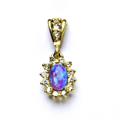 Zlatý přívěsek zdobený fialovým syntetickým opálem o velikosti 7x5 mm a malými čirými zirkony. Celková výška přívěšku je 22 mm, orientační hmotnost 1,85 g. Vyhotoveno ze žlutého zlata ryzosti 585/1000.