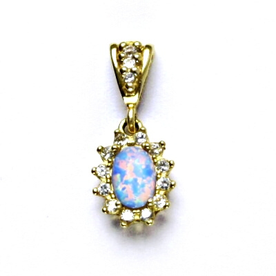 Zlatý přívěsek zdobený světle modrým syntetickým opálem o velikosti 7x5 mm a malými čirými zirkony. Celková výška přívěšku je 22 mm, orientační hmotnost 1,85 g. Vyhotoveno ze žlutého zlata ryzosti 585/1000.