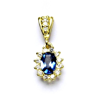 Přívěsek je vyroben ze žlutého zlata. Je zdoben syntetickým akvamarinem tmavým o rozměru 7x5 mm a malými čirými zirkony. Materiál je zlato 585/1000. Orientační váha přívěsku je 1,85 g