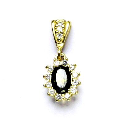 Přívěsek je vyroben ze žlutého zlata. Je zdoben syntetickým olivínem o rozměru 7x5 mm a malými čirými zirkony. Materiál je zlato 585/1000. Orientační váha přívěsku je 1,85 g
