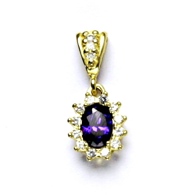 Přívěsek je vyroben ze žlutého zlata. Je zdoben syntetickým ametystem o rozměru 7x5 mm a malými čirými zirkony. Materiál je zlato 585/1000. Orientační váha přívěsku je 1,85 g