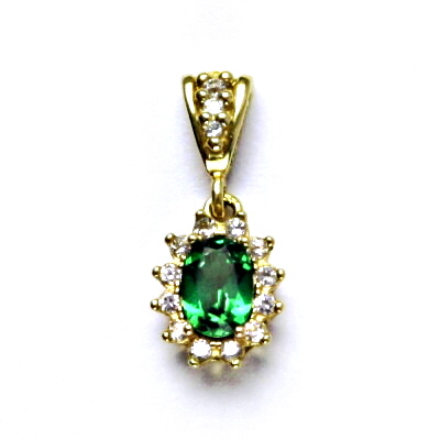 Přívěsek je vyroben ze žlutého zlata. Je zdoben zirkonem - emerald o rozměru 7x5 mm a malými čirými zirkony. Materiál je zlato 585/1000. Orientační váha přívěsku je 1,85 g