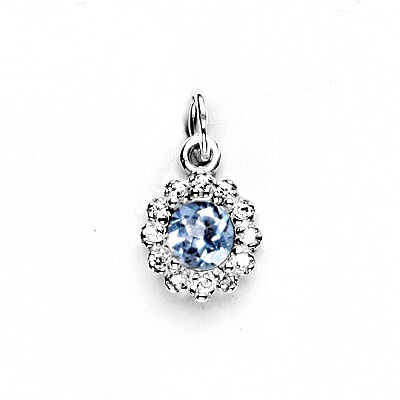 Zlatý přívěsek ve stylu populárního modelu Kate zdobí syntetický akvamarin o průměru 5,5 mm, po jehož obvodu jsou zasazeny čiré zirkony.