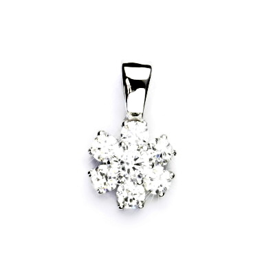 Přívěsek z bílého zlata s čirými zirkony - kytička. Materiál je zlato 585/1000. Orientační váha přívěsku je 1,45 g. Rozměr přívěsku je 16 mm včetně úchytu na výšku a 10 mm na šířku.