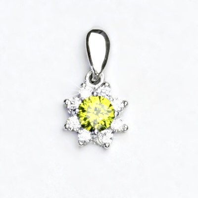 Přívěsek z bílého zlata s čirými zirkony a zirkonem v barvě olivínu o průměru 5,5 mm - kytička. Materiál je zlato 585/1000. Orientační váha přívěsku je 1,59 g. Rozměr přívěsku je 18 mm včetně úchytu na výšku a 10 mm na šířku.