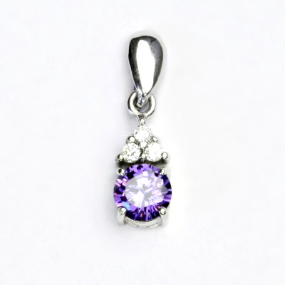Přívěsek z bílého zlata zdobí čiré zirkony a zirkon ametyst o průměru 6 mm.