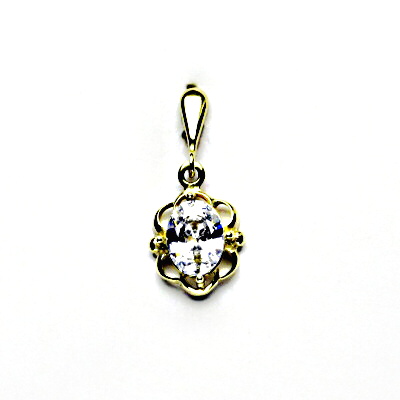 Zlatý přívěsek zdobený čirým zirkonem velikosti 8x6 mm. Rozměry zdobné části jsou 11x5 mm, celková výška šperku 23 mm, orientační hmotnost 1,27 g. Vyhotoveno ze žlutého zlata ryzosti 585/1000.