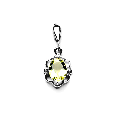 Zlatý přívěsek zdobený přírodním olivovým křemenem-lemon velikosti 8x6 mm. Rozměry zdobné části jsou 11x5 mm, celková výška šperku 23 mm, orientační hmotnost 1,27 g. Vyhotoveno z bílého zlata ryzosti 585/1000.