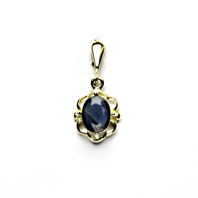 Zlatý přívěsek zdobený přírodním safírem velikosti 8x6 mm. Rozměry zdobné části jsou 11x5 mm, celková výška šperku 23 mm, orientační hmotnost 1,27 g. Vyhotoveno ze žlutého zlata ryzosti 585/1000.