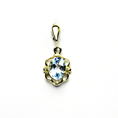 Zlatý přívěsek zdobený přírodním topazem sky velikosti 8x6 mm. Rozměry zdobné části jsou 11x5 mm, celková výška šperku 23 mm, orientační hmotnost 1,27 g. Vyhotoveno ze žlutého zlata ryzosti 585/1000.
