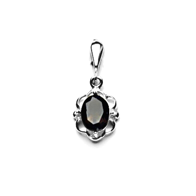 Zlatý přívěsek zdobený přírodní záhnědou velikosti 8x6 mm. Rozměry zdobné části jsou 11x5 mm, celková výška šperku 23 mm, orientační hmotnost 1,27 g. Vyhotoveno z bílého zlata ryzosti 585/1000.