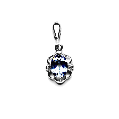 Zlatý přívěsek zdobený syntetickým světlým akvamarinem velikosti 8x6 mm. Rozměry zdobné části jsou 11x5 mm, celková výška šperku 23 mm, orientační hmotnost 1,27 g. Vyhotoveno z bílého zlata ryzosti 585/1000.