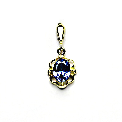 Zlatý přívěsek zdobený syntetickým tmavým akvamarinem velikosti 8x6 mm. Rozměry zdobné části jsou 11x5 mm, celková výška šperku 23 mm, orientační hmotnost 1,27 g. Vyhotoveno ze žlutého zlata ryzosti 585/1000.