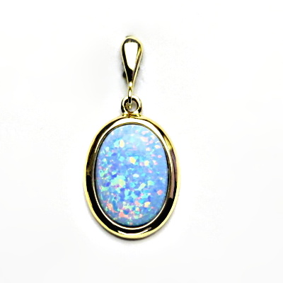 Zlatý přívěsek zdobený syntetickým opálem o rozměrech 14 x 10 mm.