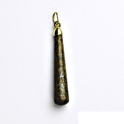 Zlatý přívěsek je zdoben přírodním hnědým jaspisem. Materiál je zlato 585/1000. Orientační váha přívěsku je 2,1 g. Rozměr přívěsku je 38 mm včetně očka na výšku a 6 mm na šířku.