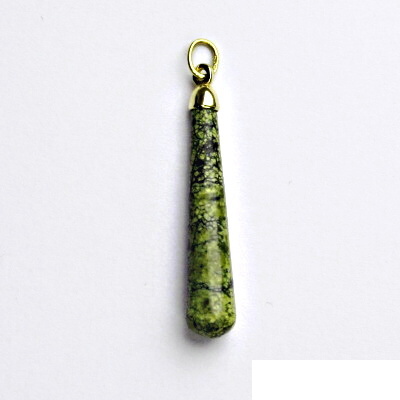 Zlatý přívěsek je zdoben přírodním serpentinem. Materiál je žluté zlato 585/1000. Orientační váha přívěsku je 2,1 g. Rozměr přívěsku je 39 mm včetně očka na výšku a 6 mm na šířku.