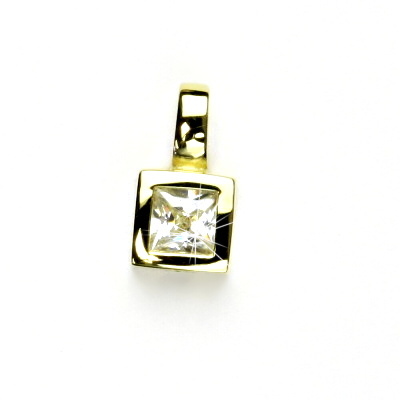 Přívěsek ze žlutého zlata je zdoben čirým zirkonem o rozměru 5x5 mm. Materiál je zlato 585/1000. Orientační váha přívěsku je 1,45 g. Rozměr přívěsku je 14 mm včetně úchytu na výšku a 7 mm na šířku.