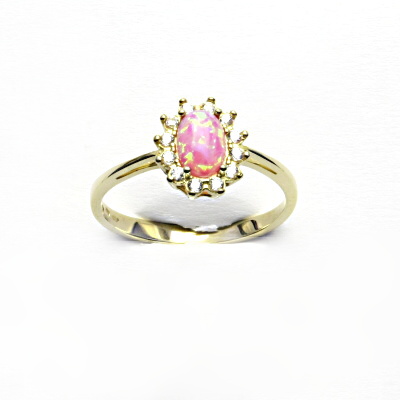 Zlatý prsten Kate, syntetický růžový opál, čiré zirkony, žluté i bílé zlato - T 1480