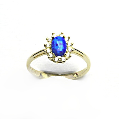 Zlatý prsten Kate, syntetický tm. modrý opál, čiré zirkony, žluté i bílé zlato - T 1480