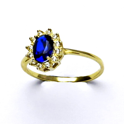 Zlatý prsten je zdobený čirými zirkony a syntetickým zirkonem .