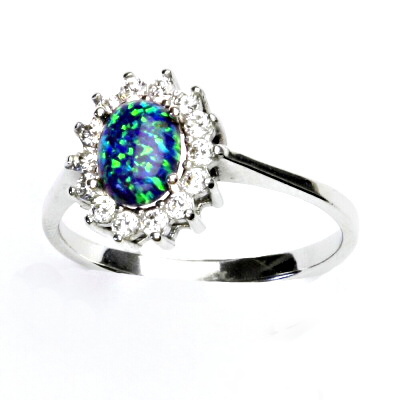 Prstýnek z bílého zlata je zdoben malými čirými zirkony a syntetickým zeleným opálem o rozměru 8x6 mm. Materiál je zlato 585/1000. Orientační váha prstenu ve velikosti 54 je 3,05 g.