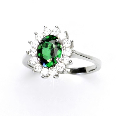 Prstýnek z bílého zlata je zdoben malými čirými zirkony a zirkonem emerald o rozměru 8x6 mm. Materiál je zlato 585/1000. Orientační váha prstenu ve velikosti 54 je 3,05 g. Prsten nabízíme v různých velikostech.