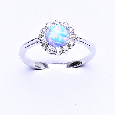 Zlatý prsten, bílé zlato, světle modrý syntetický opál, čiré zirkony, T 1495