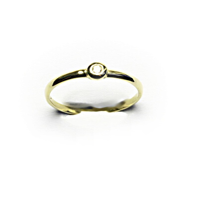 Jemný prsten ze žlutého zlata zdobí zirkon o velikosti 2 mm .