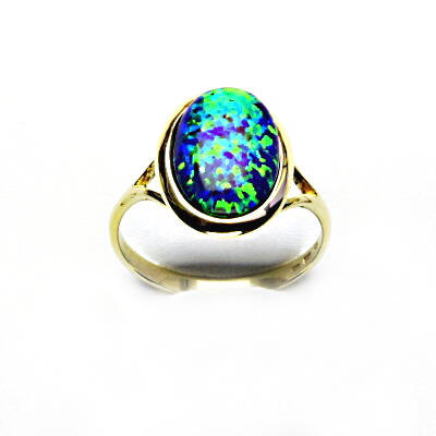 Zlatý prsten zdobí syntetický opál o velikosti 14 x 10 mm