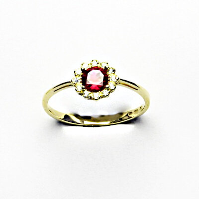 Elegantní zlatý prsten ve stylu populárního modelu Kate zdobený červeným zirkonem o průměru 5,5 mm a zirkony čiré barvy zasazenými po jeho obvodu. Materiál, z něhož je šperk vyhotoven, je žluté zlato ryzosti 585/1000. Orientační hmotnost prstenu při velikosti 65 je 2,33 g.