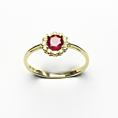Zlatý prsten, žluté i bílé zlato, přírodní rubín, čiré zirkony - T 1495