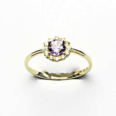 Zlatý prsten, žluté i bílé zlato, přírodní světlý ametyst, čiré zirkony - T 1495