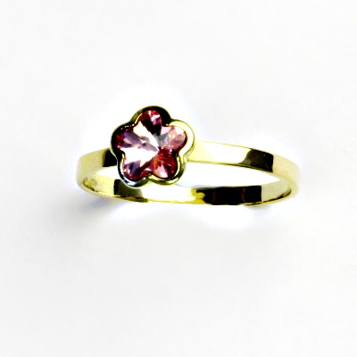 Prstýnek ze žlutého zlata se Swarovski krytalem ve tvaru kytičky. Barva krystalu - light rose. Materiál je zlato 585/1000. Orientační váha prstenu ve velikosti 51 je 1,23 g.