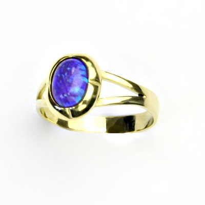 Zlatý prsten zdobí fialový syntetický opál velikosti 8 x 6 mm.