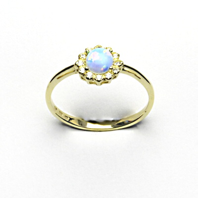 Zlatý prsten, žluté zlato, světle modrý syntetický opál, čiré zirkony, T 1495